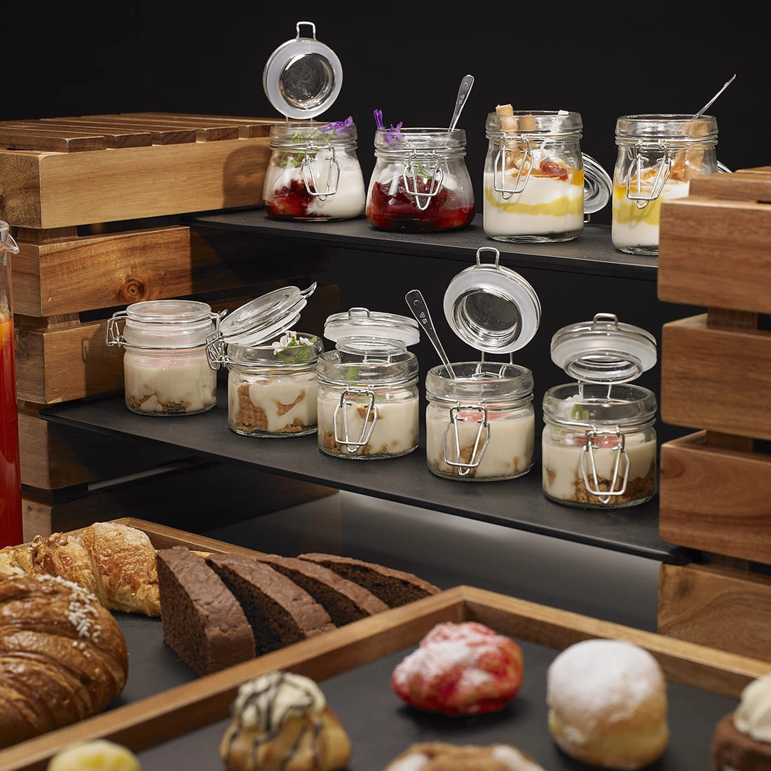 - Estetyka: Elegancki design z połączeniem drewna i czarnych melaminowych płyt, idealny do bufetów śniadaniowych i przyjęć