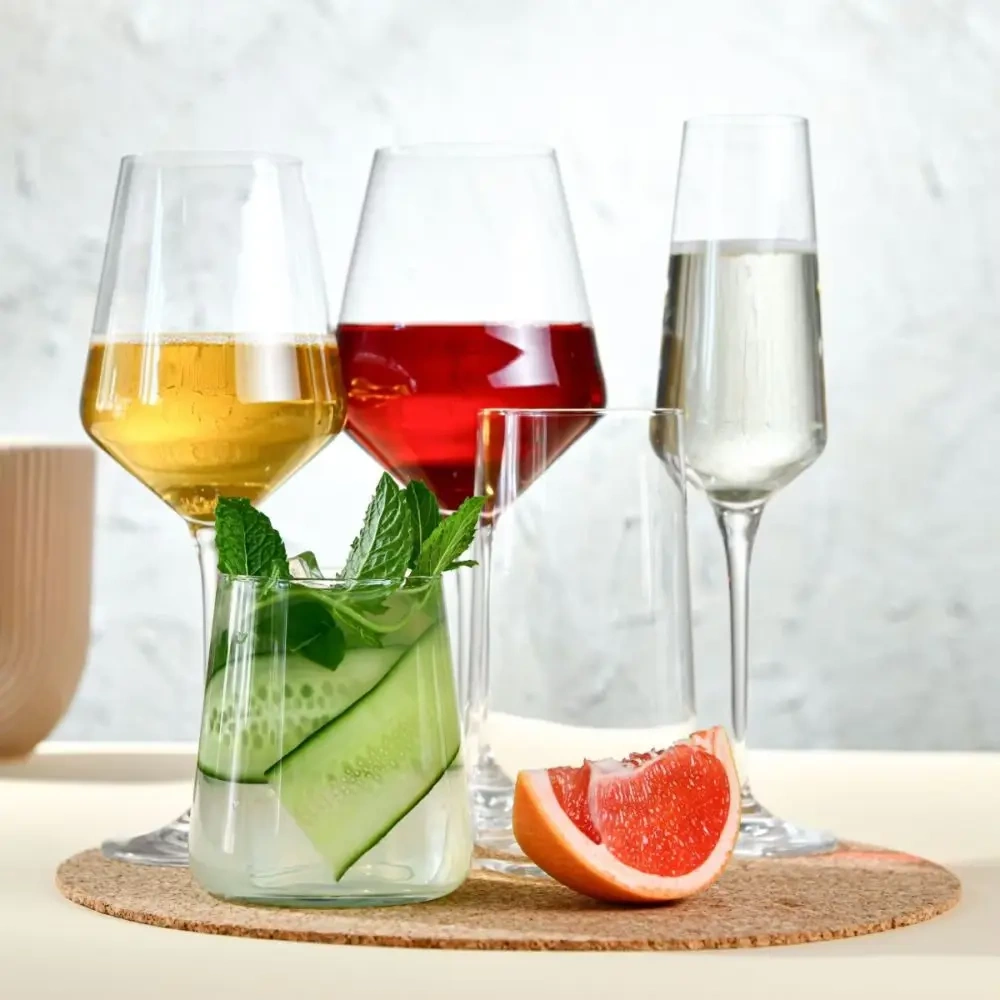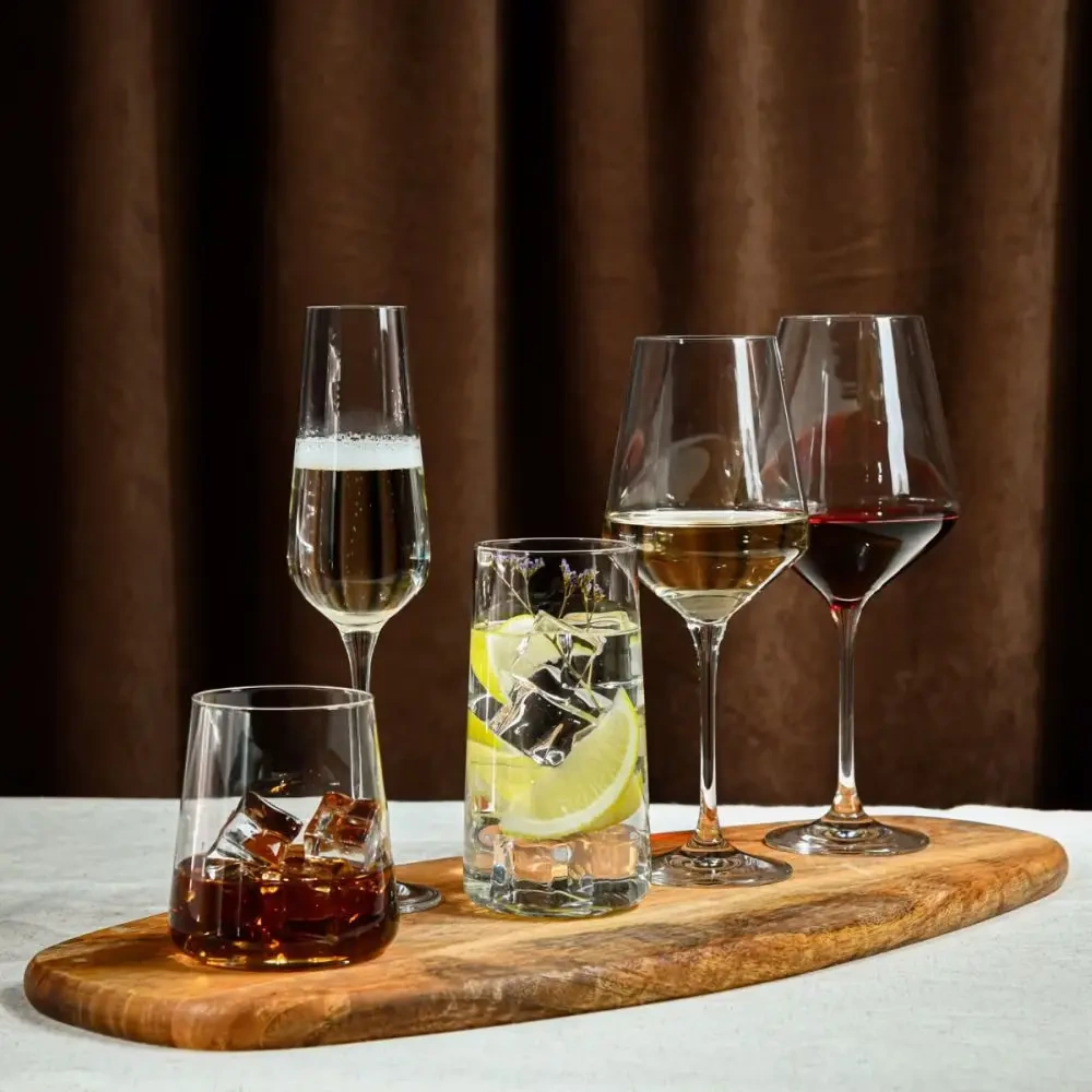 - Wielofunkcyjność: Zestaw obejmuje kieliszki do czerwonego i białego wina, kieliszki do szampana oraz wysokie i niskie szklanki, dzięki czemu można serwować szeroki wachlarz napojów – od win i szampana po drinki i napoje bezalkoholowe.