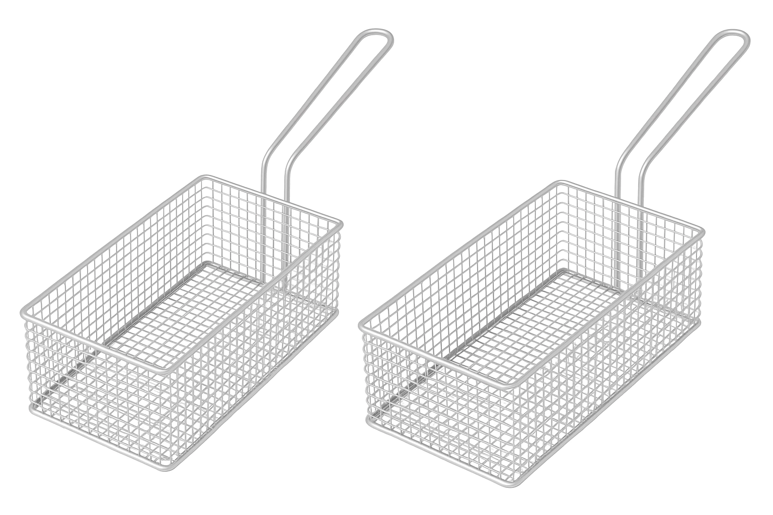 - Wymiary: 12,5 cm x 28 cm x 10 cm – kompaktowe rozmiary umożliwiają łatwe umieszczenie koszy w frytownicy oraz ich przechowywanie.