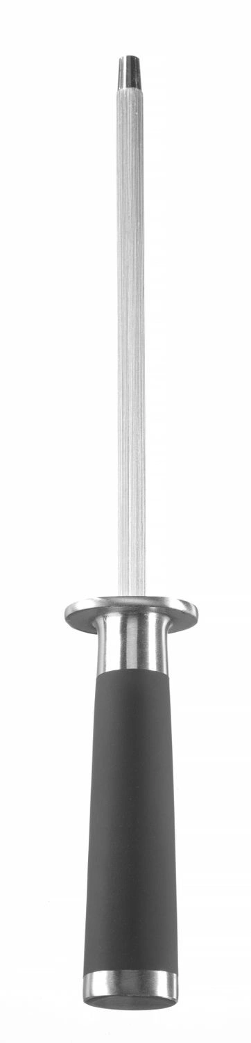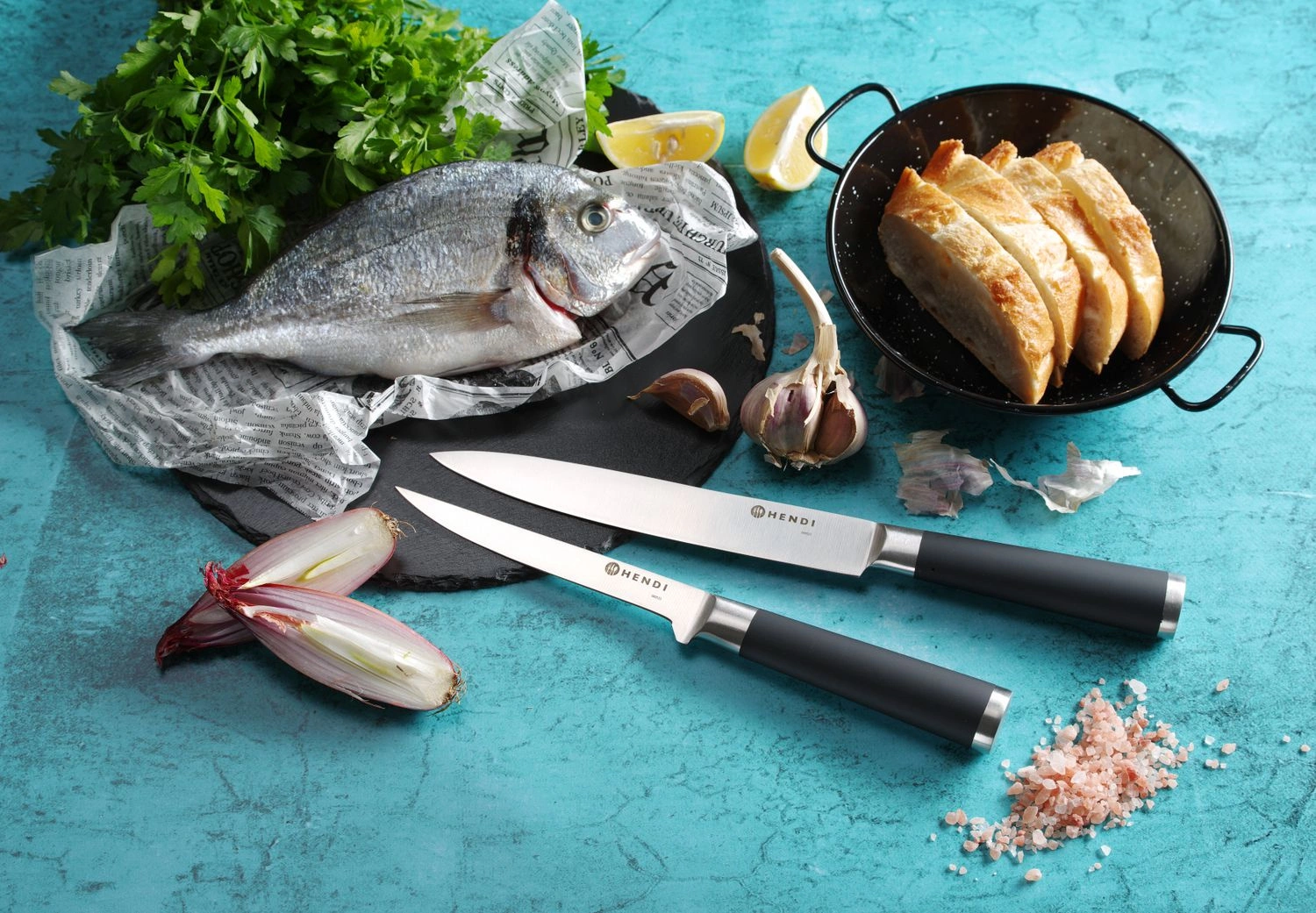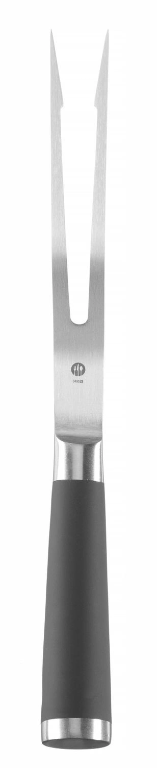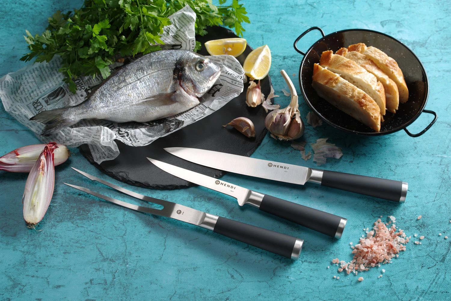 Zestaw noży kutych z edycji Kurta Schellera w pokrowcu. Noże wykonane z jednego kawałka stali nierdzewnej 3CR13. Uchwyt ze stali nierdzewnej 410 z powłoką gumowaną. Rękojeści noży dopasowane w sposób uniemożliwiający gromadzenie się resztek w miejscu łączenia.