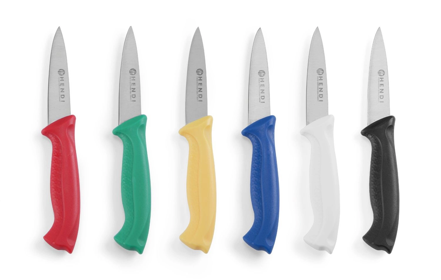 Zestaw nożyków do obierania HACCP o długości ostrza 9 cm każdy. W zestawie 6 sztuk w kolorach: biały, czerwony, niebieski, zielony, czarny, żółty. Wykonane ze stali walcowanej.
