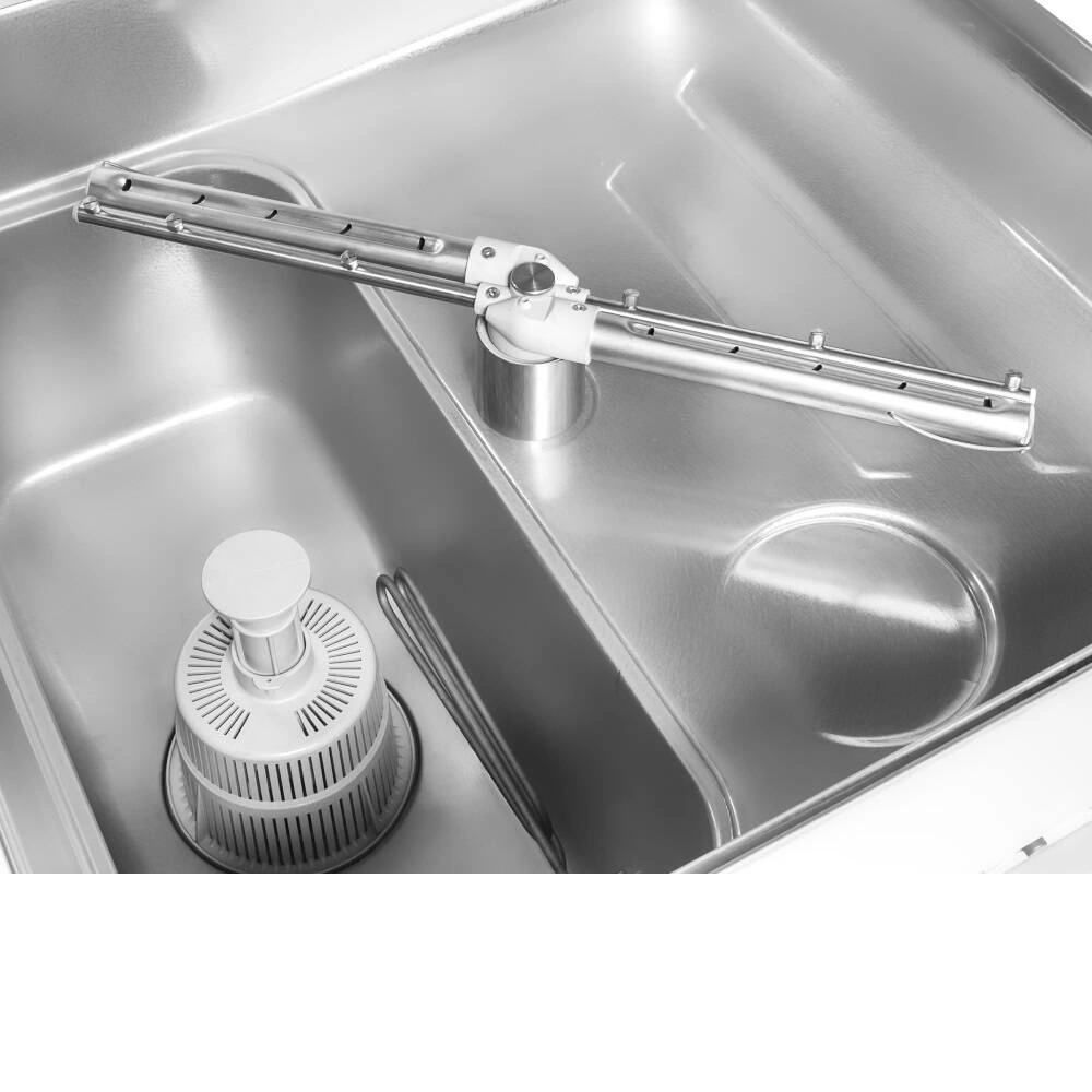 W standardzie zmywarka wyposażona jest w dozownik płynu nabłyszczającego, dozownik płynu myjącego, pompę odpływu, 2 kosze na 12/18 talerzy 50x50 cm, kosz płaski na szkło 50x50 cm oraz 2 pojemniki na sztućce. Wszystkie elementy wykonano z trwałych materiałów, zapewniających długą żywotność i łatwość utrzymania w czystości. Dodatkowo, zastosowanie tłoczonej wanny i filtrów ze stali nierdzewnej ułatwia codzienną konserwację urządzenia.