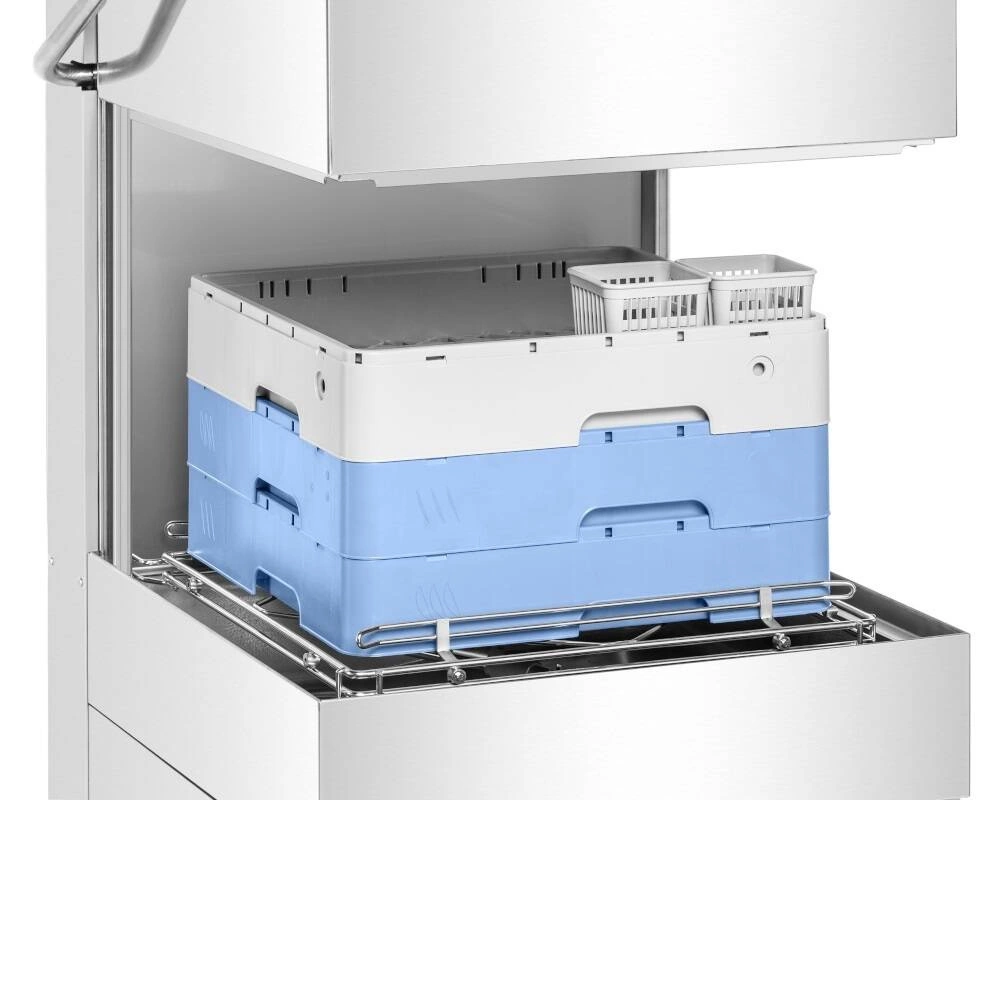 - Wysoka wydajność i szybkie cykle mycia – Zmywarka umożliwia mycie do 40 koszy na godzinę, przy długości cyklu 90 lub 120 sekund. Dzięki temu sprawdzi się idealnie w miejscach, gdzie liczba naczyń do umycia jest bardzo duża, jak kuchnie hotelowe czy szkolne.