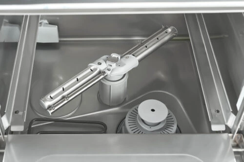 Urządzenie zostało zaprojektowane z myślą o wygodzie użytkownika oraz trwałości. Korpus i bojler wykonano ze stali nierdzewnej AISI 304, co zapewnia odporność na uszkodzenia mechaniczne i korozję. Podwójna ścianka drzwi zwiększa izolację termiczną, a zaokrąglona wanna ułatwia czyszczenie wnętrza zmywarki. Łatwo demontowalne ramiona myjące i płuczące pozwalają na szybkie utrzymanie sprzętu w czystości, co jest szczególnie ważne w lokalach o dużym obrocie naczyń. Wbudowany filtr pompy oraz system filtracji wody dodatkowo zabezpieczają urządzenie przed zanieczyszczeniami, zwiększając jego żywotność.