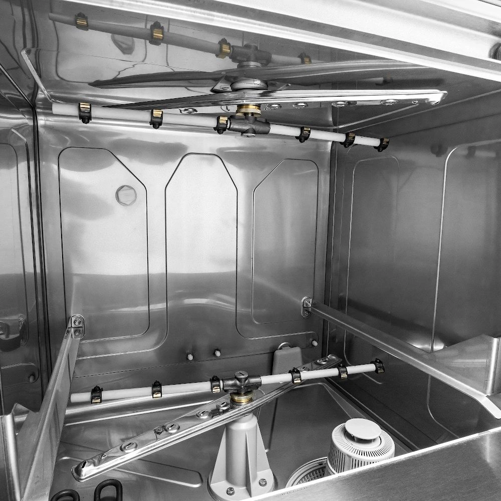 - Zaawansowana technologia mycia i wyparzania – Dzięki dolnym i górnym ramionom myjącym oraz płuczącym, naczynia są dokładnie czyszczone z każdej strony. Funkcja wyparzania w temperaturze 85°C zapewnia najwyższy poziom higieny, niezbędny w branży gastronomicznej.