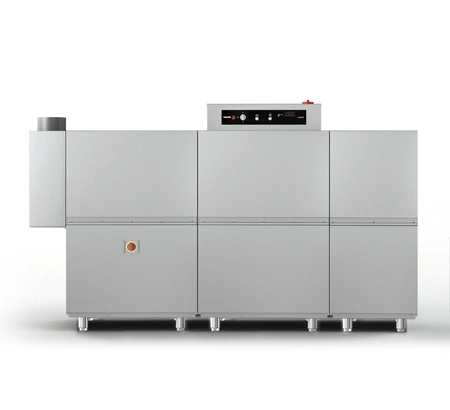 Urządzenie zostało zaprojektowane z myślą o intensywnej eksploatacji w środowisku gastronomicznym. Wysokiej jakości stal nierdzewna AISI-304 gwarantuje nie tylko odporność na działanie detergentów i wysokich temperatur, ale również łatwość czyszczenia i konserwacji. Dwupanelowe drzwi otwierane do góry zapewniają wygodny dostęp do wnętrza komory mycia, a filtry i ramiona myjące można łatwo zdemontować w celu umycia lub konserwacji. System prowadnic koszowych pozwala na sprawny przesuw wsadu, a możliwość regulacji szybkości przesuwu za pomocą falownika pozwala dopasować tempo pracy do ilości naczyń.