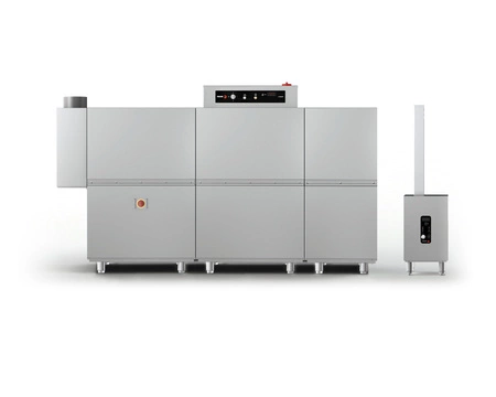 • Solidna, higieniczna konstrukcja – Wszystkie kluczowe elementy, takie jak zbiorniki, ramiona myjące, drzwi czy prowadnice koszy, wykonane są ze stali nierdzewnej AISI-304. Zapewnia to trwałość urządzenia oraz łatwość utrzymania higieny nawet przy bardzo intensywnym użytkowaniu.
