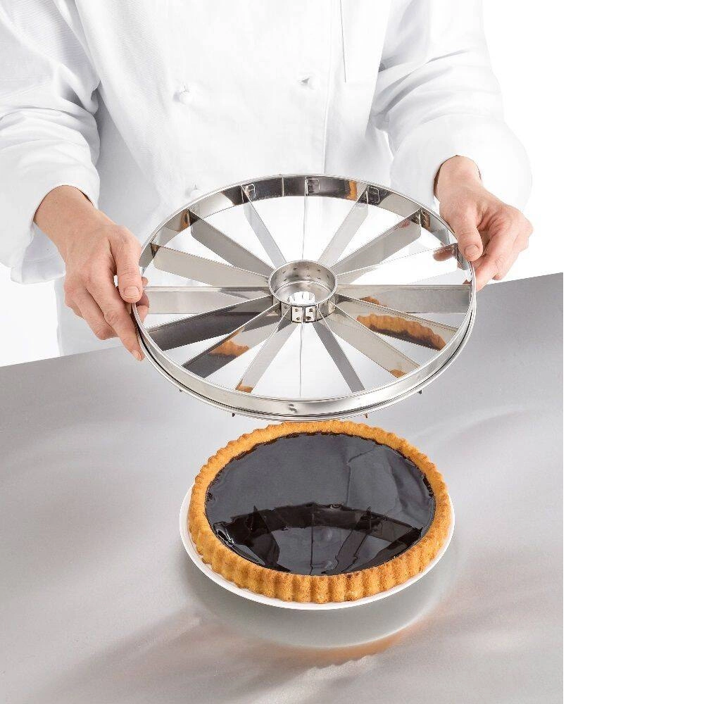 Znacznik do tortów FORGAST FG11202 został zaprojektowany z myślą o profesjonalistach i pasjonatach domowego pieczenia. Jego wytrzymała konstrukcja sprawia, że jest odporny na uszkodzenia i łatwy do utrzymania w czystości. Dzięki 16 ostrzom rozłożonym równomiernie na okręgu, można w szybki sposób zaznaczyć linie cięcia na cieście, co przyspiesza porcjowanie i pozwala uniknąć pomyłek. Narzędzie doskonale sprawdza się podczas przygotowywania tortów na imprezy rodzinne, wesela czy uroczystości firmowe, a także w codziennej pracy w cukierniach i kawiarniach.