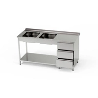 Stół nierdzewny ze zlewem 2-komorowym i blokiem 3-ch szuflad i półką 160x70x85 cm | FORGAST